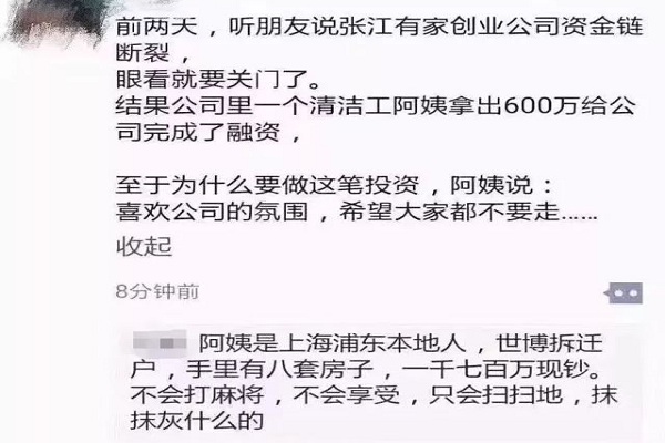 近日,一則消息清潔工張江阿姨拿出600萬現(xiàn)金幫一家創(chuàng)業(yè)公司完成融資被推上搜,據(jù)說提提情況是這樣的: